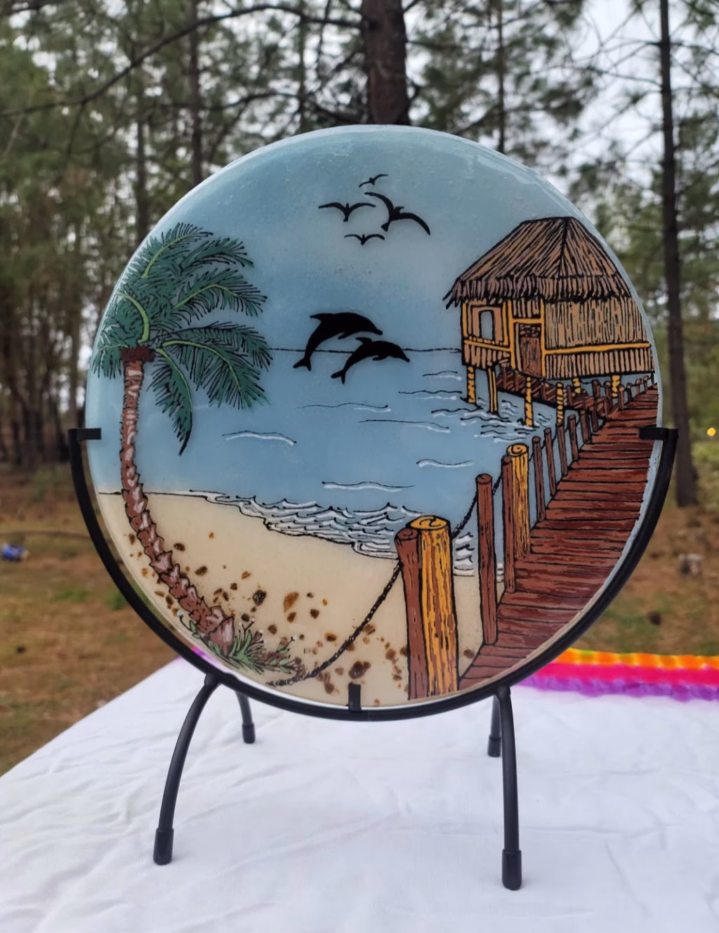 Take in the beauty of the islands with our Beach Hut with Dolphins Suncatcher, a peaceful tribute to life and memory. Each handcrafted suncatcher is infused with cremation ash during the creation process, with the ashes delicately visible in the sky above. Its original design captures a thatched hut over the water, dolphins leaping through the surf, and birds gliding across the horizon. The sky may be crafted in tranquil blues or pink sunset colors, offering a reflection of the moments most meaningful to you. Display this suncatcher in a sunlit room, hanging or on its steel stand, and watch as the light shines through, illuminating the memories held within.