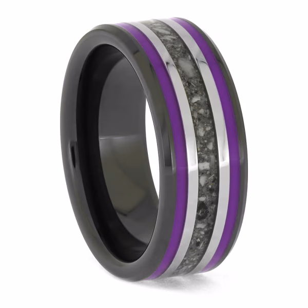 This black ceramic memorial ring is handcrafted with your loved one’s ashes permanently sealed inside the band. The ring combines polished black ceramic with purple enamel and titanium pinstripes that frame the center ash band. The contrast between the black ceramic and deep purple enamel creates a striking, refined look. The ashes are sealed under a clear protective coating for lasting durability. Each cremation ring with ashes is made to order and one of a kind.
