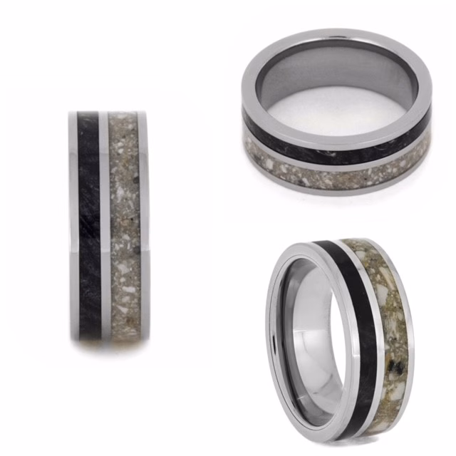 This beautiful memorial ring is a notable way to honor a loved one. Its original layout features inlays of black box elder burl wood, titanium, and cremation ash. It adds a scholarly feel to an already deeply personal ring. Its durable craftsmanship ensures it remains ideal for daily wear for generations to come.