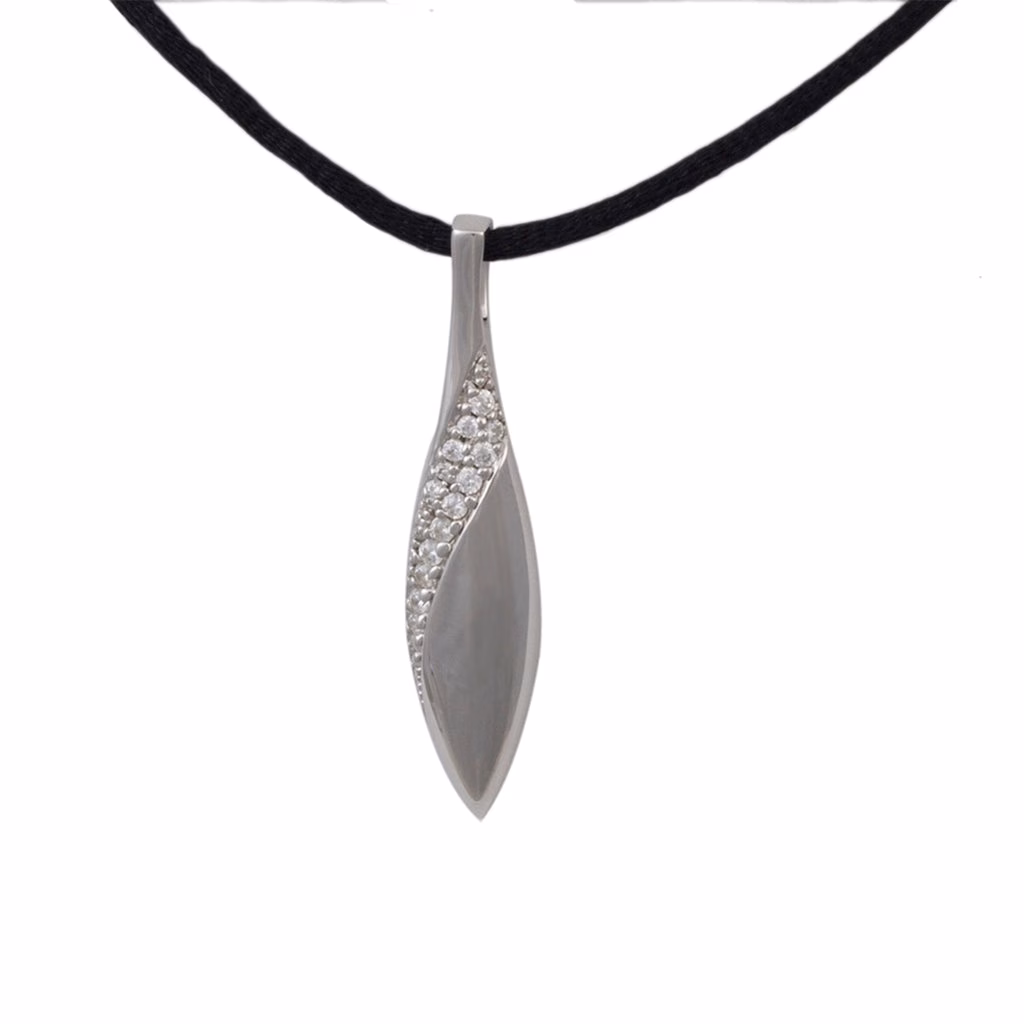 This sterling silver cremation pendant is an elegant way to remember a loved one. It showcases a curved, descending rhinestone strip, adding contrast and sparkle against the smooth, polished surface. It features a discreet chamber for ashes, accessible through a screw on the back. A fill kit with instructions and a satin cord are included.