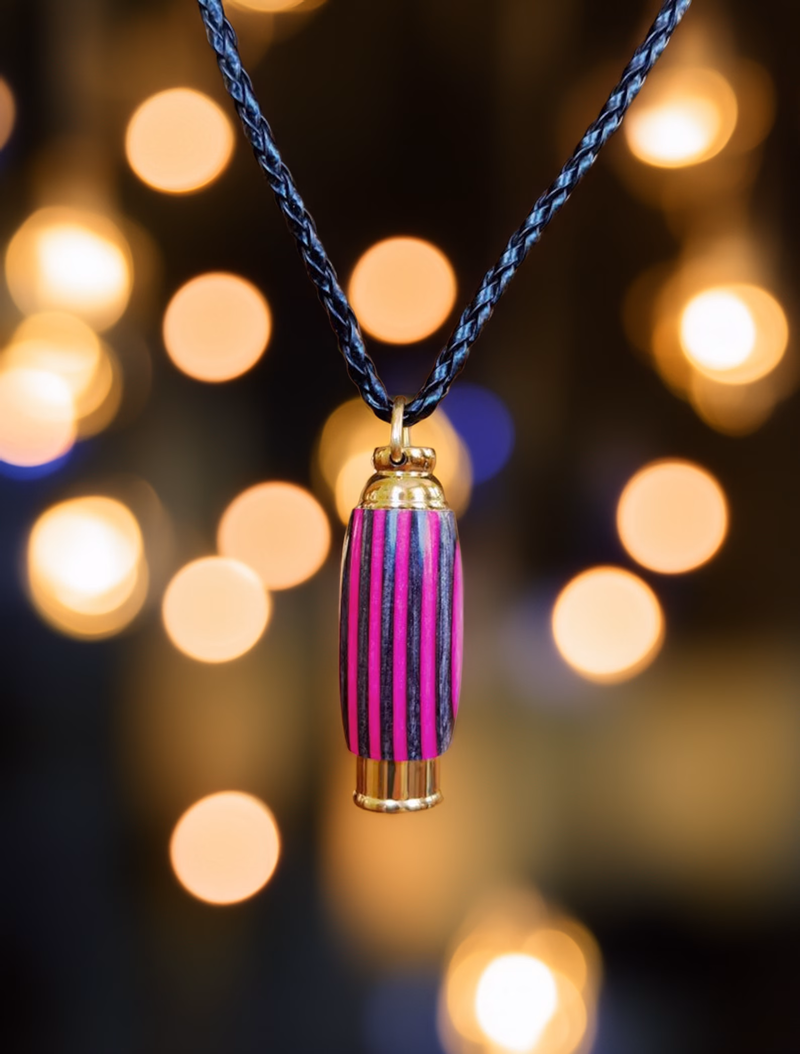 These original urn pendants offer a natural way to keep your loved one close. Each pendant features a gold stainless steel core with a hand-turned pink camo laminate wood shell. As each piece is individually made, you may see subtle variations from the displayed pendant shown, adding to its unique character. Each pendant features a discreet screw-off bottom that opens to reveal a small hollow chamber designed to hold the cremated remains. Also available as a keychain.