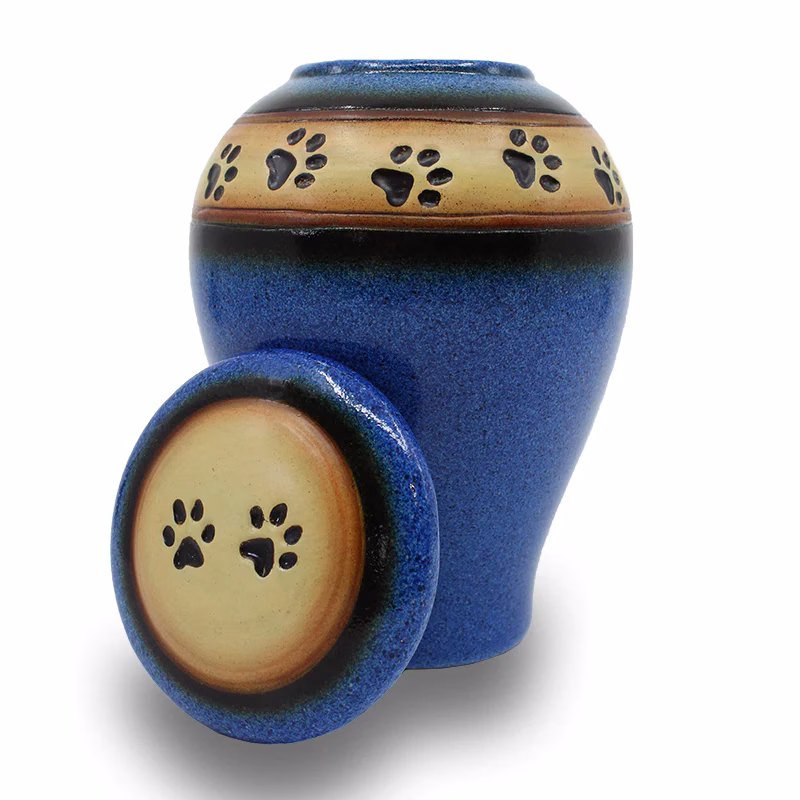 Introducing our Loving Paws Ceramic Cremation Urn, a beautiful and timeless tribute to your beloved pet. This stunning urn features a natural earth and sky design, with hand-painted blue or auburn color and a glossy textured finish, sure to catch the eye.