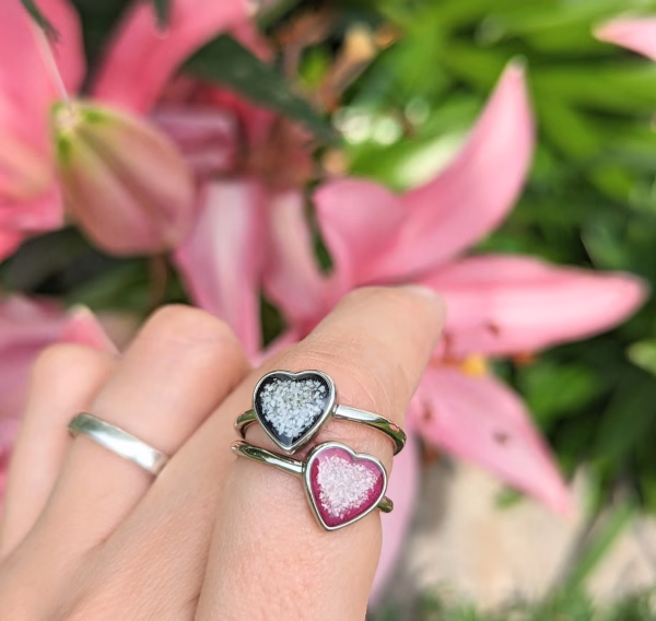 Choose from a wide range of background colors to personalize the heart – soft pastels, deep jewel tones, or natural tones that let the ashes show through. Free engraving is included if you’d like to add a name, date, or message inside the band.