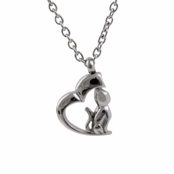 Cast in stainless steel with a polished silver finish, the pendant includes an 18-inch chain, a fill kit with funnel and instructions, and arrives ready to wear. A keepsake urn necklace for those remembering a beloved cat.