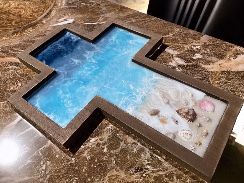 “Using the finest quality epoxy, I mix ashes with real sand from the beaches of Florida. I then add real, hand-picked shells into the sand and finish with epoxy waves. Each layer takes about 24 hours to dry.”