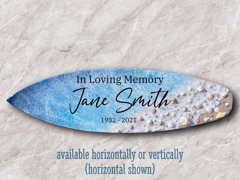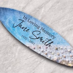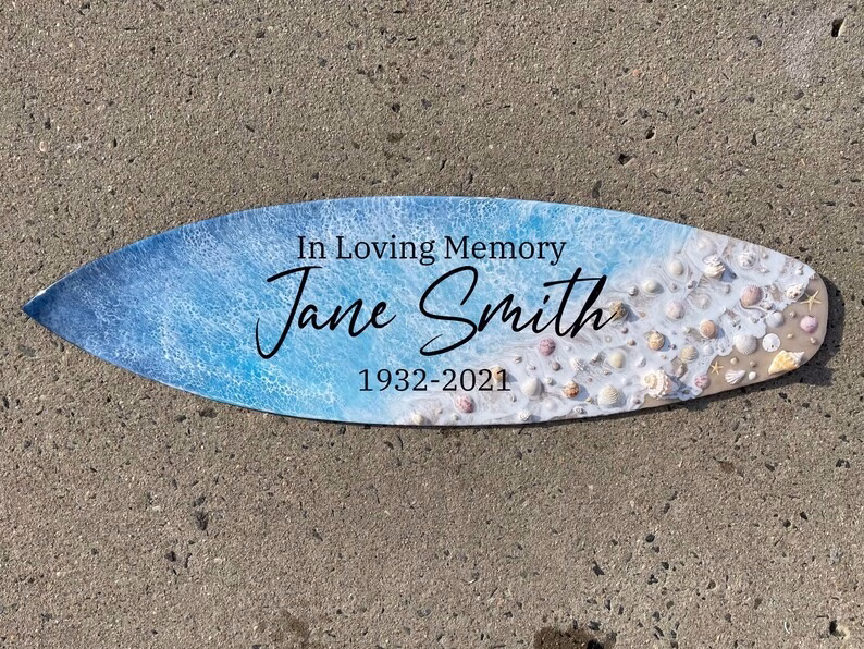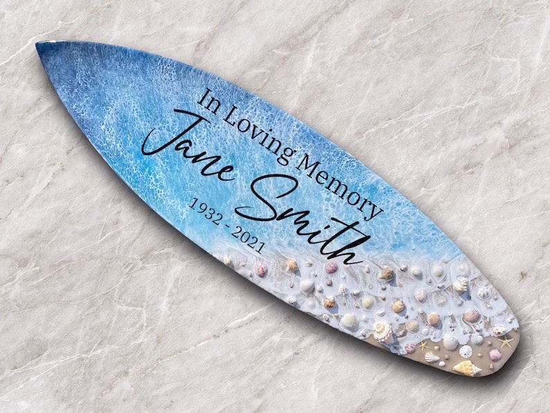Our Oceanside Memorial Surfboards are a stunning way to pay tribute to a loved one. Each uniquely crafted surfboard features your loved one’s ashes carefully infused into the artwork during the creation process. It’s the perfect item for displaying in your home, office, or beach house. If you have a specific quote or phrase you would like to use, please let us know in the text box below. Prefer to use your own seashells and sand? Our artist can use your own small 1″ (no larger) seashells in the creation of your item! Please package your seashells carefully when shipping.