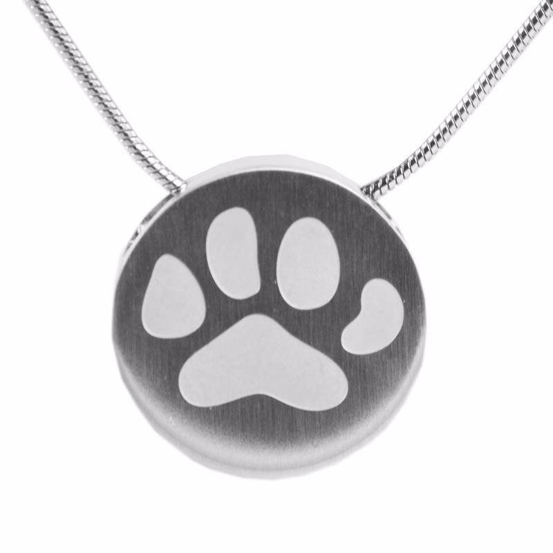 Our Paw Print Cremation Necklace is a touching tribute to your beloved pet. It’s designed for discreetly carrying ashes, added through a threaded screw on the back. A fill kit with instructions and an 18″ matching snake chain is included.