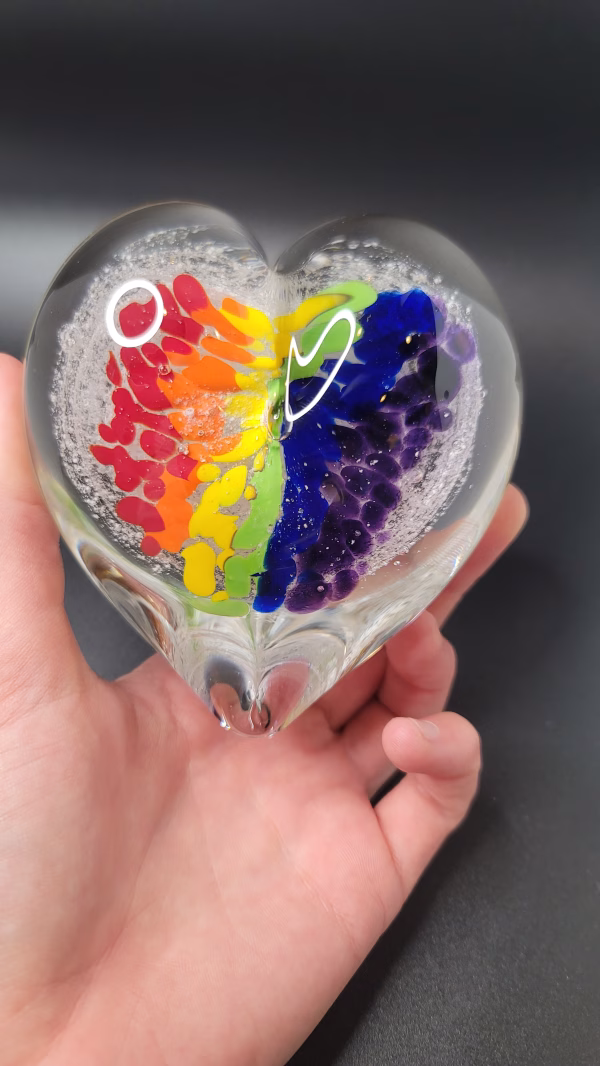 Watch a Rainbow Bridge heart-shaped paperweight take shape as a small amount of cremation ash is gently encased inside.