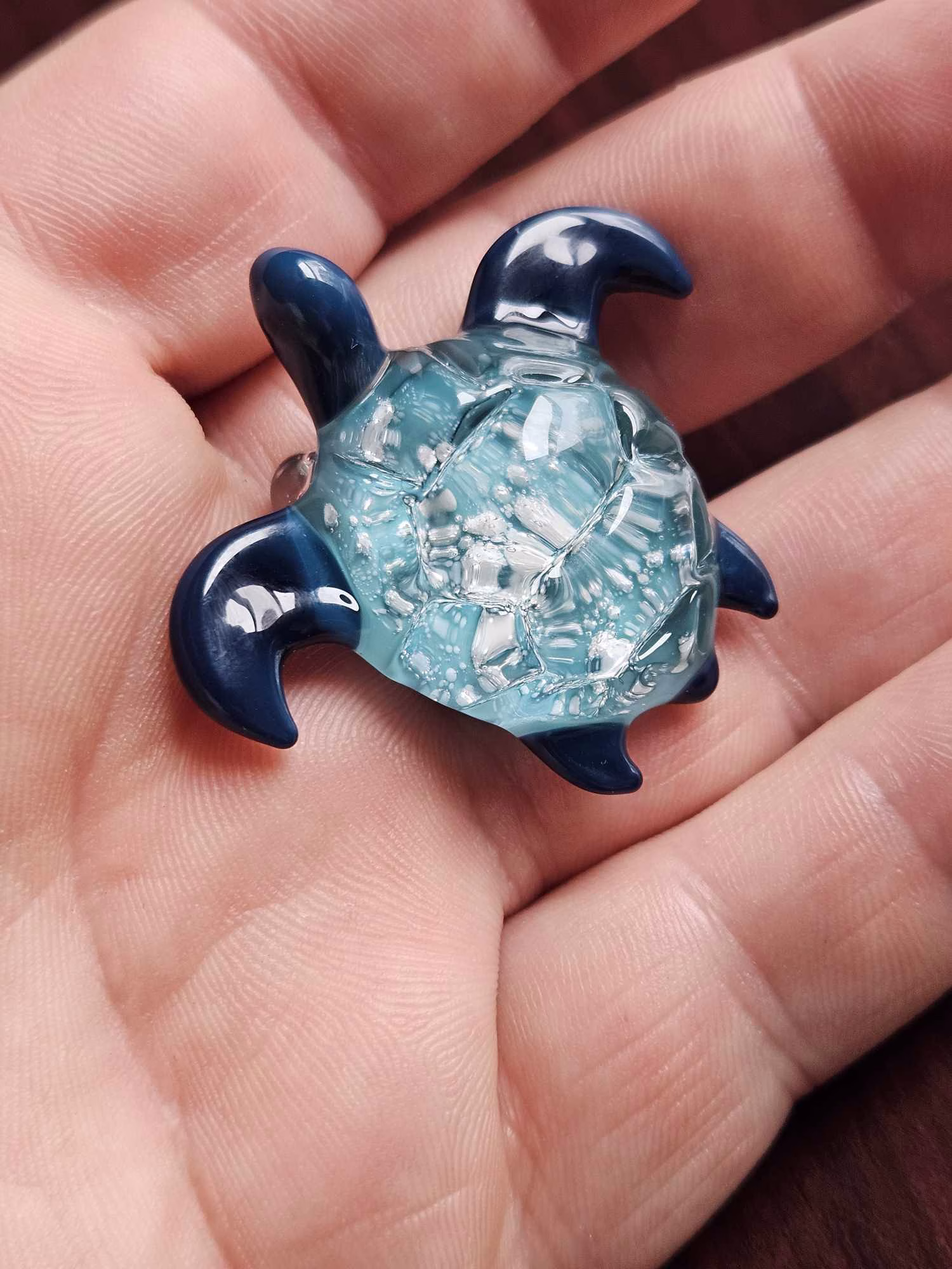 Our Sea Turtle Cremation Pendants are an ocean-inspired way to remember your loved one. Each unique pendant features a textured glass turtle shell with colored fins and a body color of your choice. The ashes are encased inside the body and are seen through the carved, clear glass turtle shell. Honor your loved one today with this beautiful sea turtle pendant.