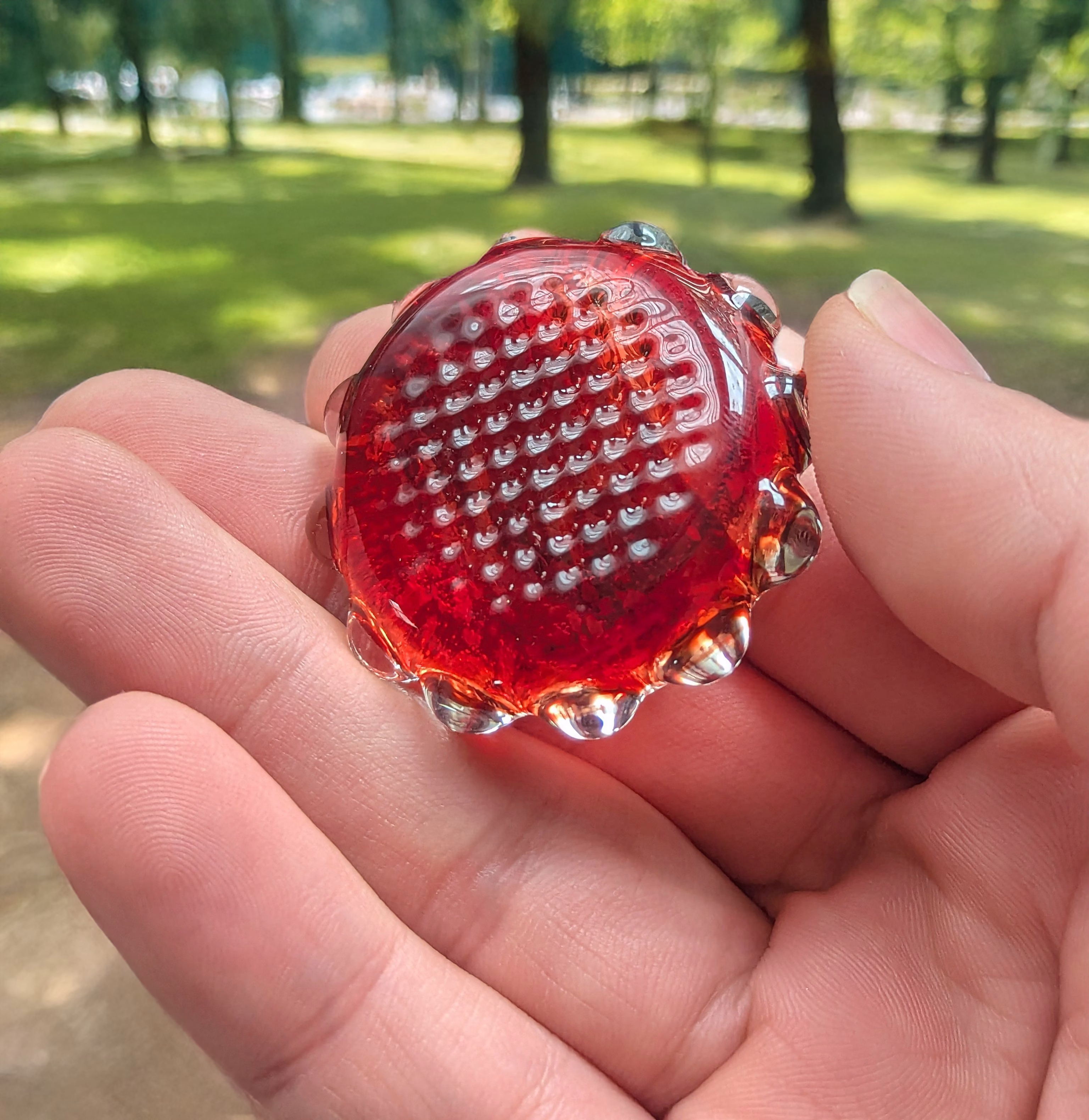 These imaginative cremation stones offer a unique take on the traditional memory stone design. Each glass stone features a small amount of cremation ash encased inside during the glassmaking process. An eternity ring of clear bumps is added to the edge of the stone for a dynamic rubbing experience. The backside is then heated and stamped with a waffle pattern, adding yet another unique sensory element.