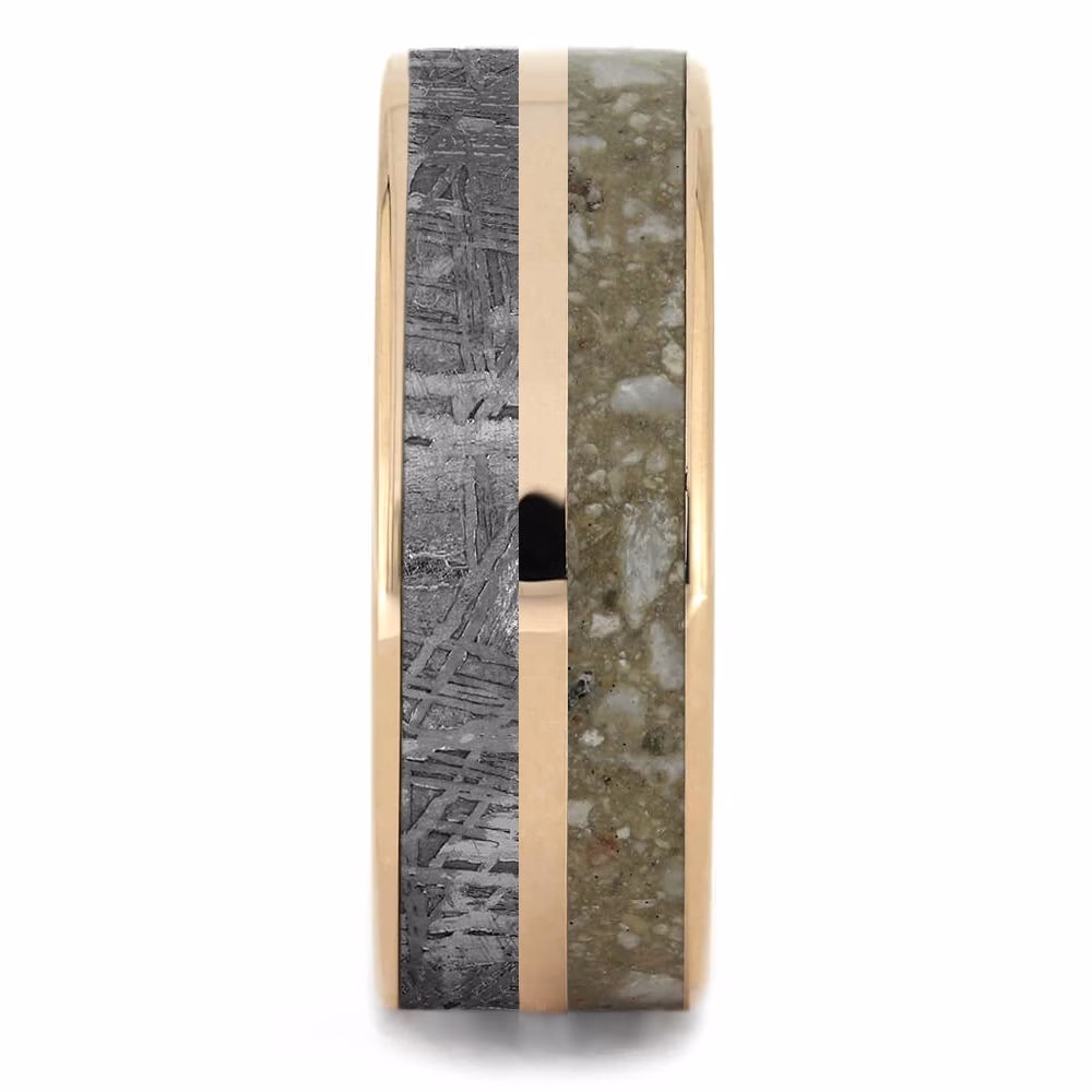 This incredible memorial ring is a celestial tribute to the memory of your loved one. Its unique layout features inlays of authentic Gibeon meteorite, rose gold, and cremation ash. The solid gold sleeve curves gently around the edges of the ring, making for a comfortable fit on the finger. Perfect for everyday wear or formal occasions.