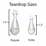These Teardrop Cremation Pendants are an elegant way to honor your loved one. Each handcrafted pendant is infused with a small amount of cremation ash during the glassmaking process. In this design, the ashes appear as white snow encased within the transparent glass teardrop. Some ashes may appear darker depending on their natural color. These pendants are considered wearable family heirlooms, intended to be cherished for generations to come.