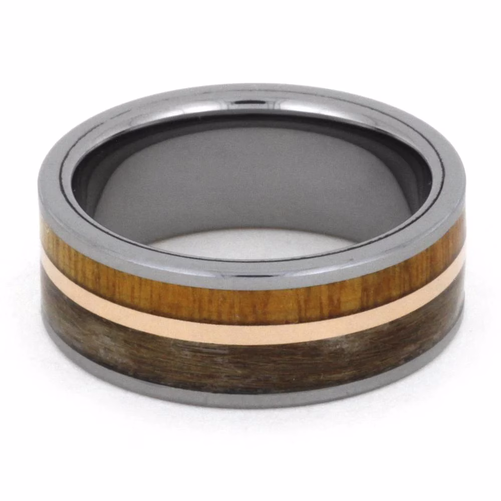 This distinguished memorial ring is a wonderful choice for honoring a beloved pet. Each handmade band features an inlay of pet fur and rowan wood separated by a single 14k rose gold pinstripe. The polished tungsten sleeve curves gently around the edges of the ring, creating a smooth and comfortable fit.